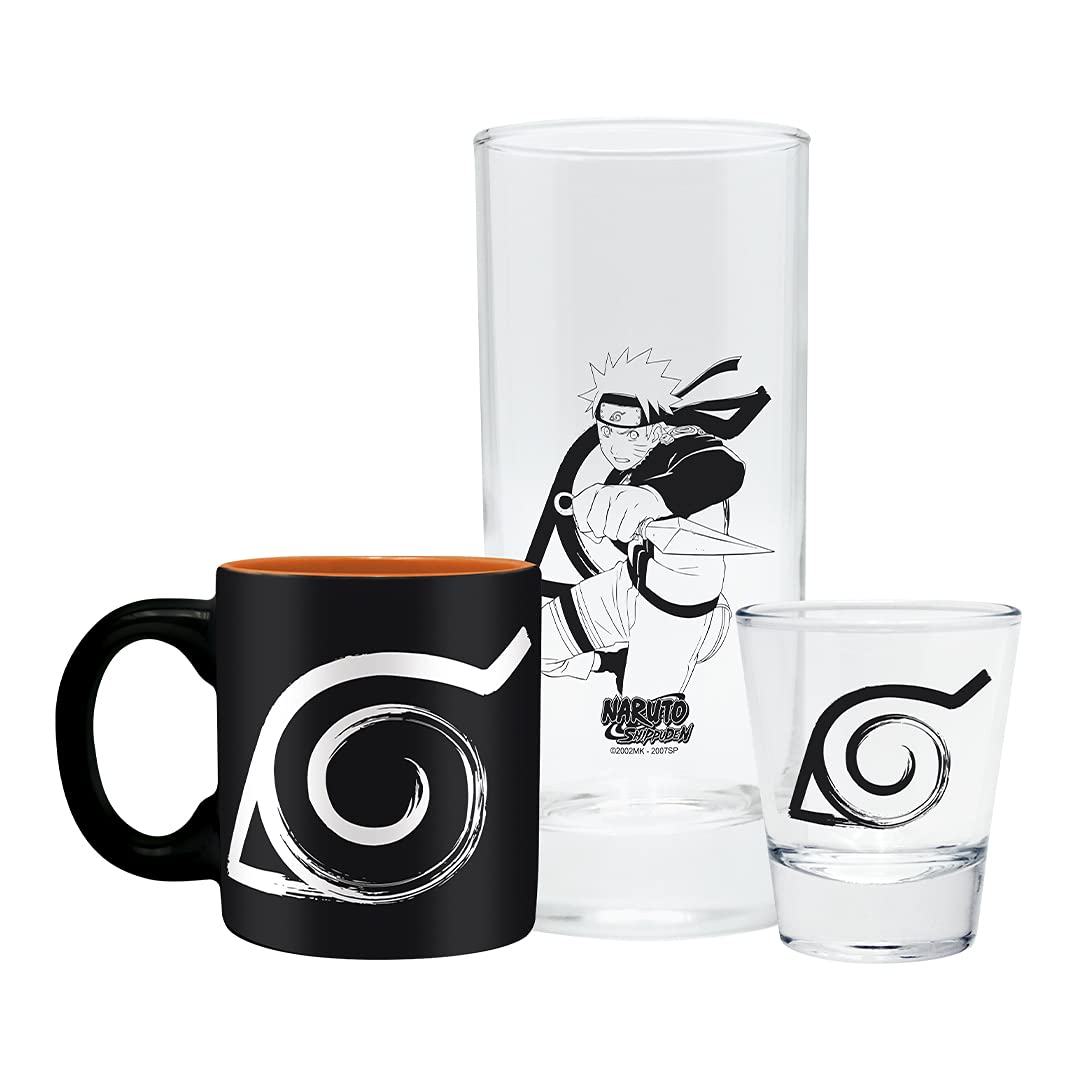 - Konoha Gift Set: The gift set includes a shot glass, espresso mug, and drinking glass, all featuring the iconic Konoha symbol from Naruto Shippuden. The set is perfect for showcasing your love for the Hidden Leaf Village.